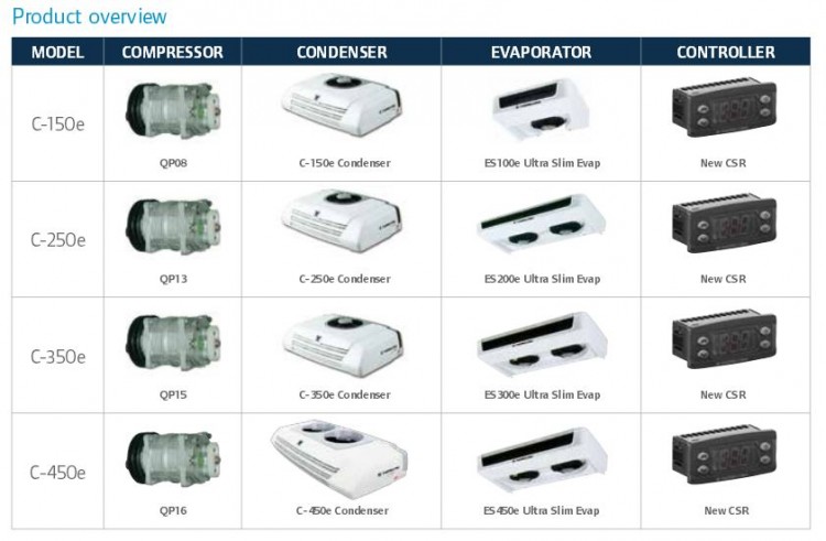 2014 júniusától a Thermo King C sorozatának készülékei továbbfejlesztett változatban lesznek elérhetőek. Az új C-150e, C-250e és C-350e berendezések az eddigi C-100, 200, illetve 300-as modelleket váltják fel, a C-450e személyében pedig egy új, nagyobb teljesítményű (4000W / 0⁰C, 2260W / -20⁰C) taggal bővül a járműmotoros hűtők családja. Újdonság, hogy a készülékek R-404A hűtőközeggel is rendelhetőek, amelyekkel (megfelelő szigetelés mellett) 22⁰C és -32⁰C között szabályozható a raktér hőmérséklete. Ezen gépek esetében a fűtési, valamint a leolvasztási funkciók garantálják az árukár elkerülését és az üzembiztos működést. Az új CSR vezérlés kényelmes és egyszerű üzemeltetést biztosít. További kérdésekkel keresse üzletkötő kollégáinkat!